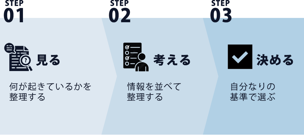 本書では、「なぜ迷うのか」をやさしくひも解きながら、判断が生まれるまでの流れを、次の3つの観点で整理していきます。